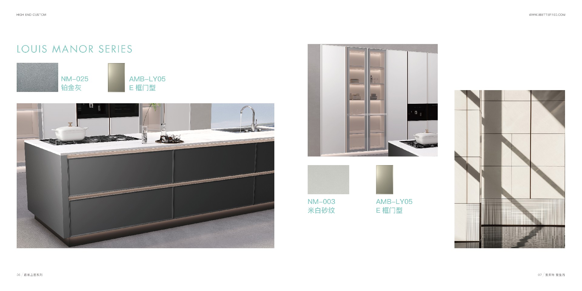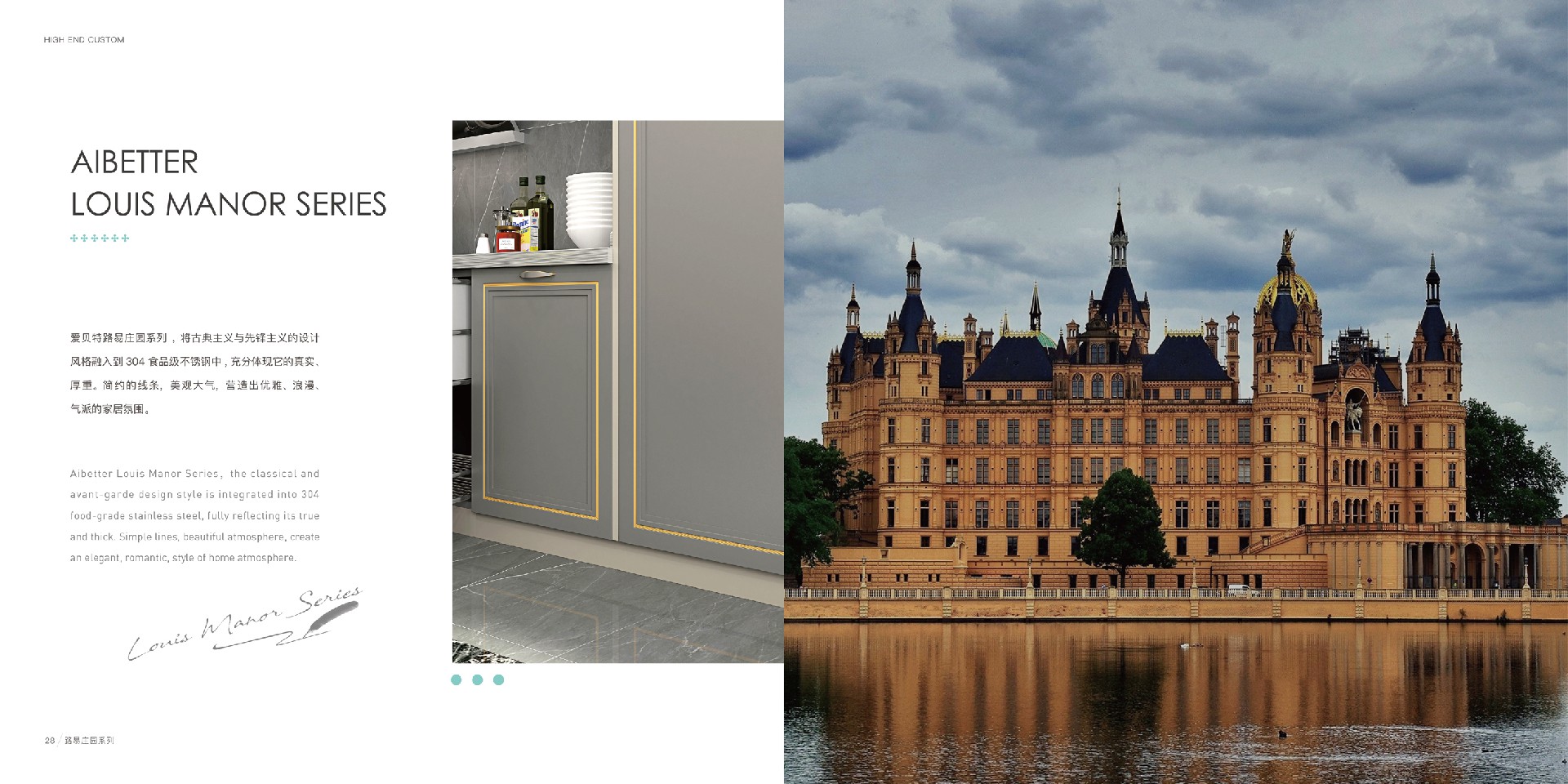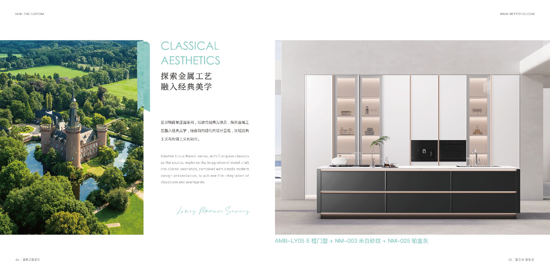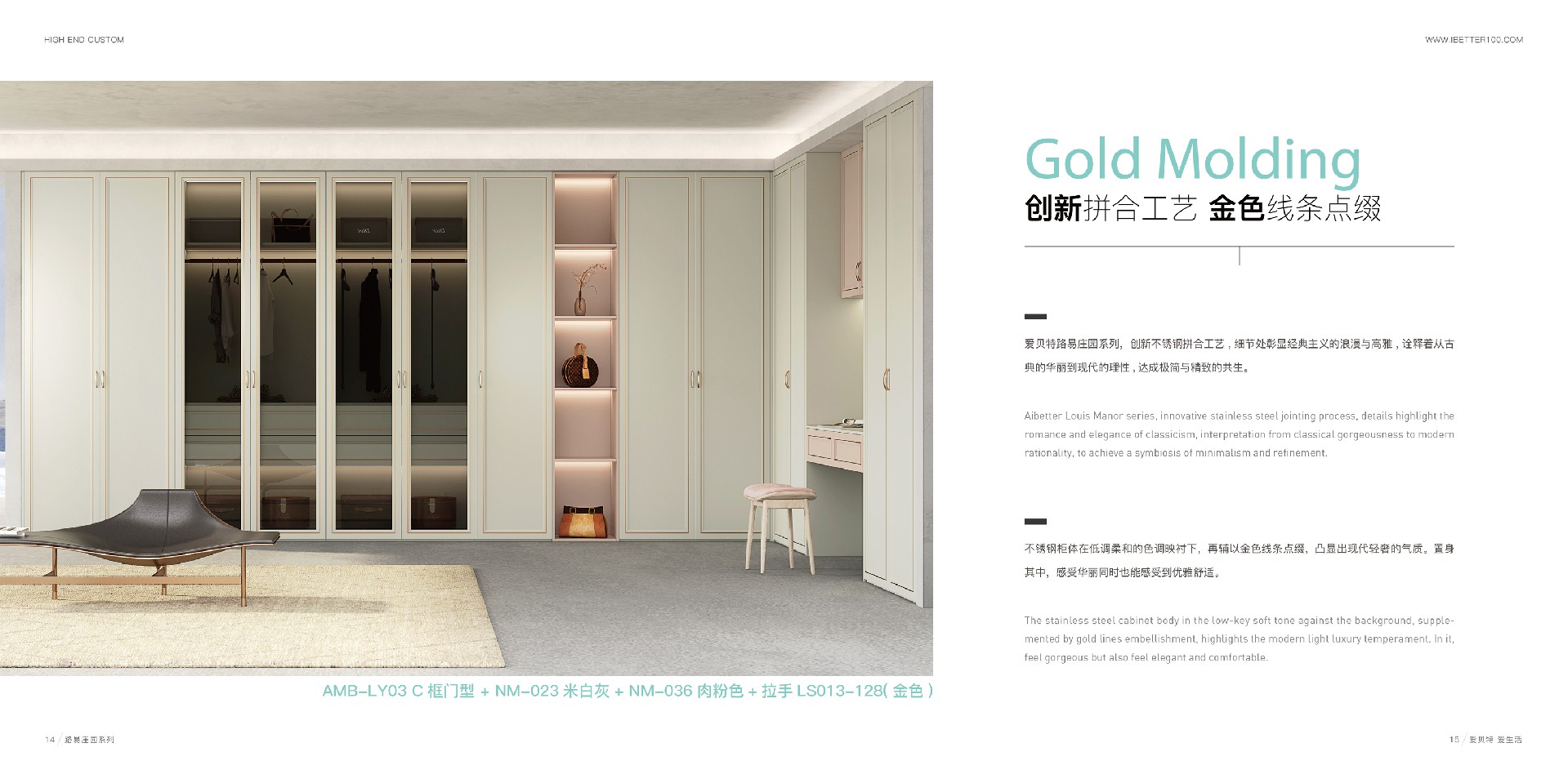 以欧式经典为源泉,探索金属工艺融入现代商业美学,路易庄园系列,创新不锈钢拼合工艺,细节处彰显经典主义的浪漫与高雅,诠释着从古典的华丽到现代的理性,达成极简与精致的共生。不锈钢柜体在低调柔和的色调映衬下,再辅以金色线条点缀,凸显出现代轻奢的气质,置身其中,感受华丽同时也能感受到优雅舒适。